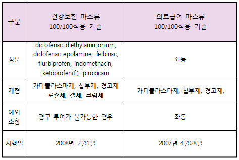 ÀÌ´ÞºÎÅÍ ½ÃÇàµÈ °Ç°º¸Çè ÀÏ¹Ý¾à ÆÄ½º·ù Àü¾× º»Àκδ㠱ÔÁ¤À» º¸¸é diclofenac diethylammonium, diclofenac epolamine, felbinac, flurbiprofen, indomethacin, ketoprofen(f.), piroxicam µîÀ» ÇÔÀ¯ÇÑ ÀǾàǰ Áß Á¦ÇüÀÌ Ä«Å¸Çö󽺸¶Á¦, °æ°íÁ¦, ÆÐÃëÁ¦ ¿Ü¿¡ ·Î¼ðÁ¦, °ÖÁ¦, Å©¸²Á¦±îÁö ¾à°ªÀ» ȯÀÚ°¡ ºÎ´ãÇØ¾ß ÇÑ´Ù.