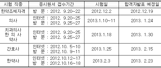 Çѱ¹º¸°ÇÀÇ·á±¹°¡½ÃÇè¿øÀº 27ÀÏ 2012³âµµ ÇÏ¹Ý±â ¹× 2013³âµµ »ó¹Ý±â º¸°ÇÀÇ·áÀÎ ±¹°¡½ÃÇè ½ÃÇàÀÏÁ¤À» ¹ßÇ¥Çß´Ù.