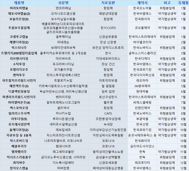 In July, 3 new drugs were introduced, including the eosinophilic asthma treatment ‘Fasenra Prefilled Syringe,’ the hemophilia treatment ‘Idelvion Inj,’ and the anti-cancer drug ‘Xpovio Tab.’ In August, the CAPS treatment ‘Ilaris Inj’ and schizophrenia and bipolar disorder treatment ‘Latuda Tab’ were listed.