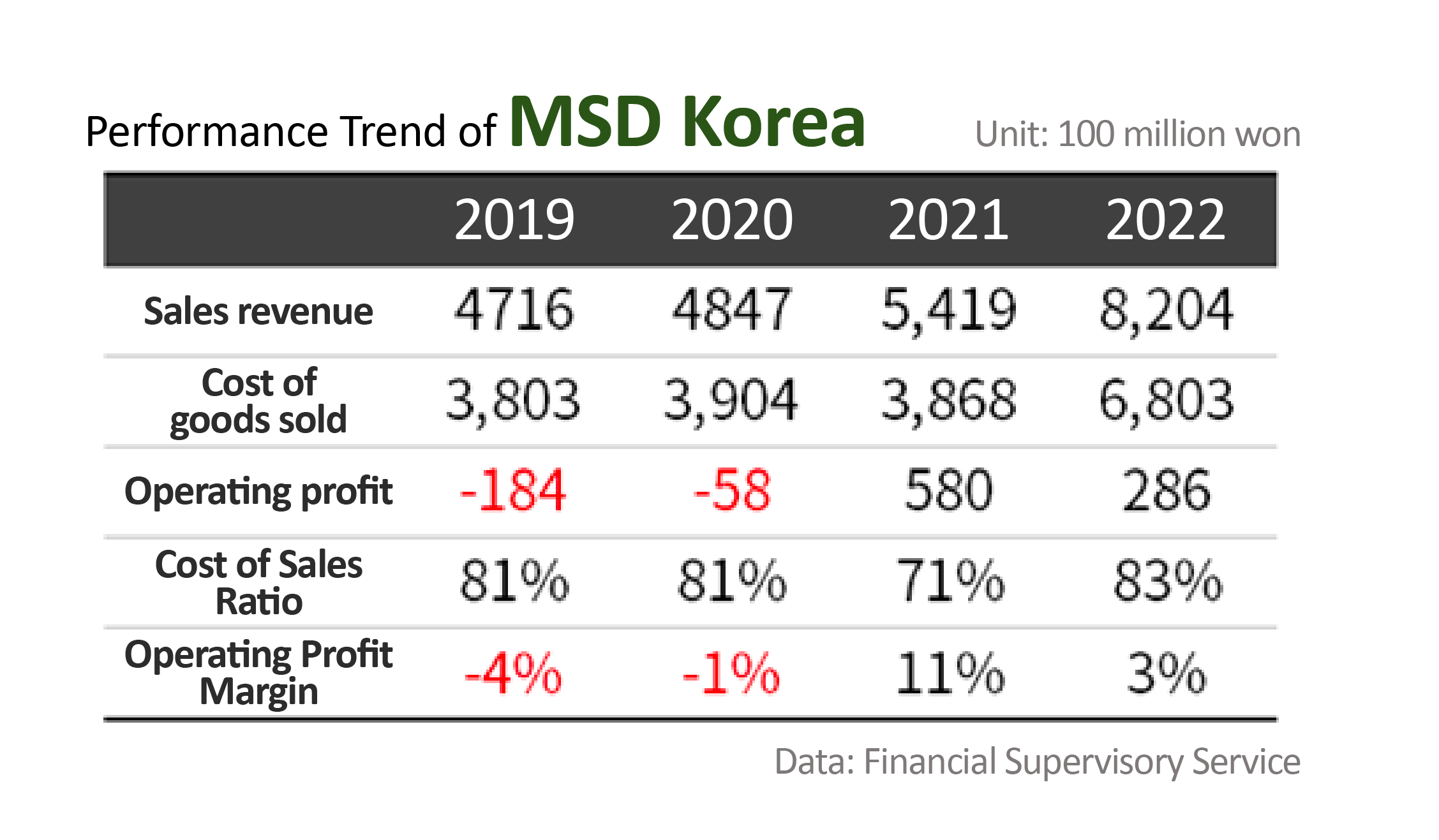 MSD Korea posted an operating loss of KRW 18.4 billion in 2019 and KRW 5.8 billion in 2020 and turned to a profit of 58 billion in 2021.