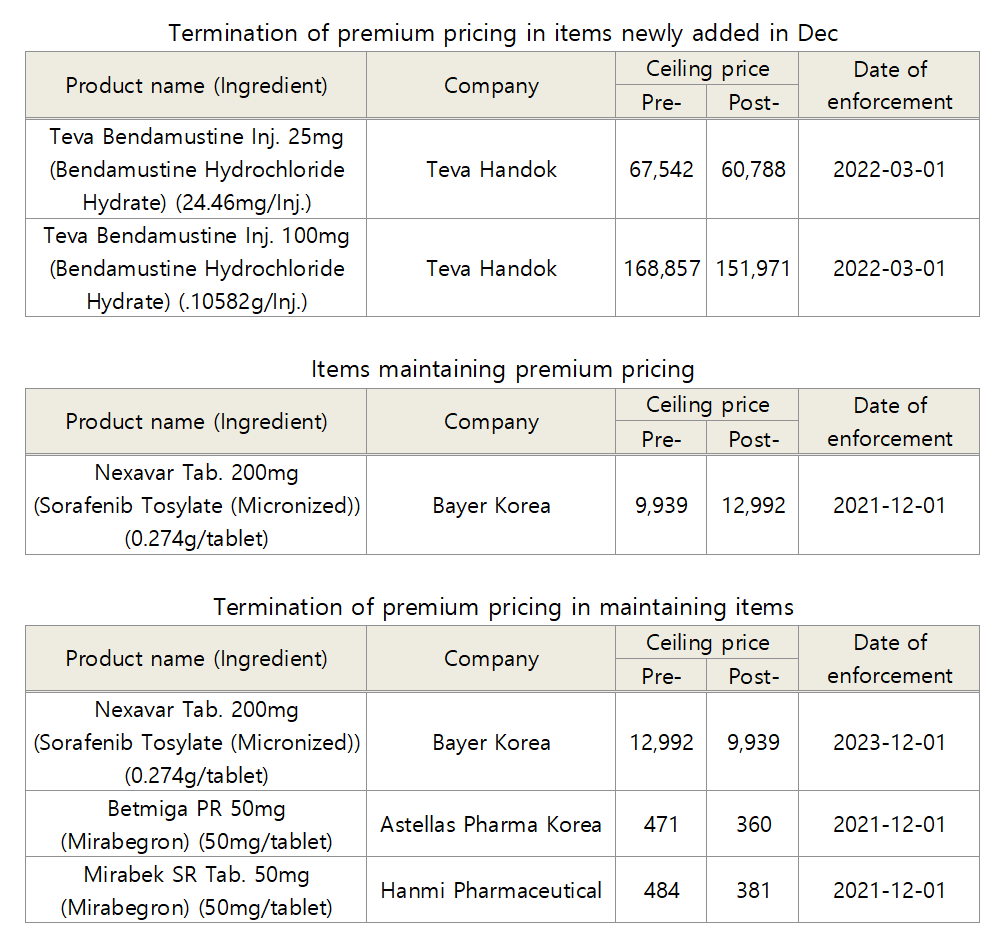 Also, the price of Astellas Korea Betmiga (mirabegron), which had been fluctuating due to the suit filed by the company to cancel the government’s price cut decision, will be reduced by 23.6% on the same day due to the premium pricing period expiry.
