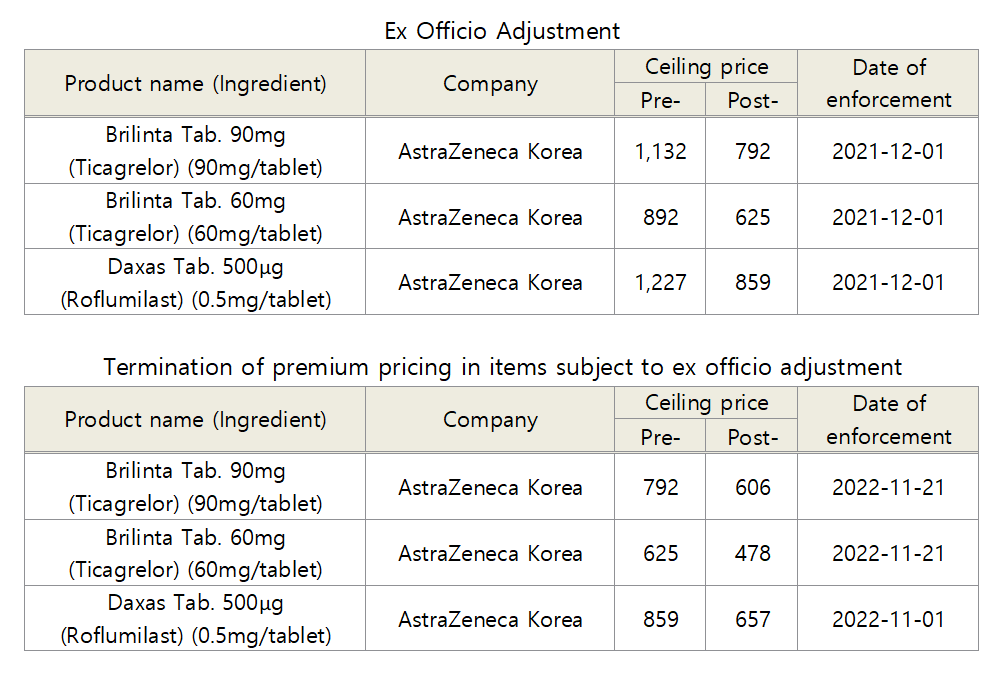 The price of Brilinta will be reduced by 23.5% for each dose from November 21st, 2022, and the price of Daxas 500μg will be reduced by 23.5% from November 1st, 2022.