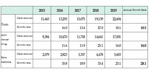 Claims for serious diseases in 2019 amounted to ₩2.2 trillion, accounting for 11.7% of total drug costs.