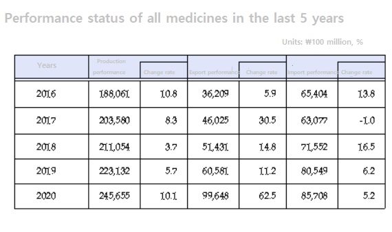In 2020, drug production increased 10.1% year-on-year to ₩24.565.5 trillion, while export performance increased 5.2% year-on-year to ₩9.96 trillion ($8.44 billion), 62.5% year-on-year and import performance to ₩8.57 trillion ($7.26331 billion).