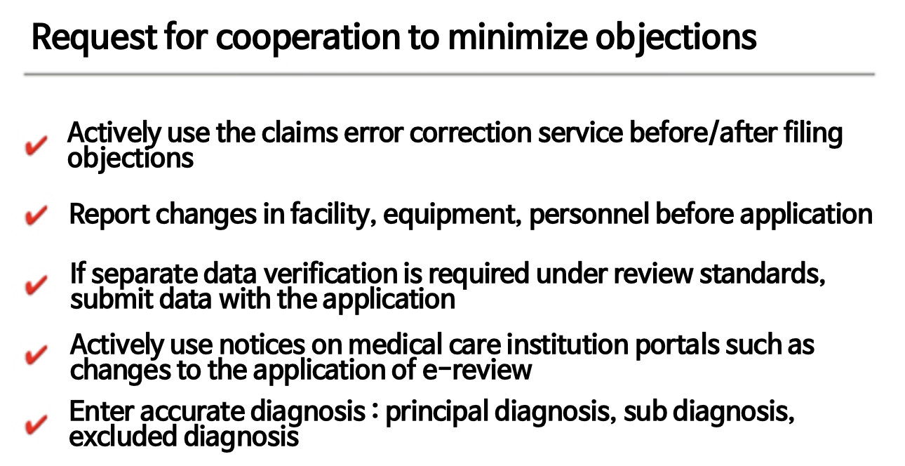 Medical institutions may check for errors identified before claiming benefits through the pre-inspection service to prevent adjustment of medical expenses, minimize supplementary claims, and prevent filing objections.
