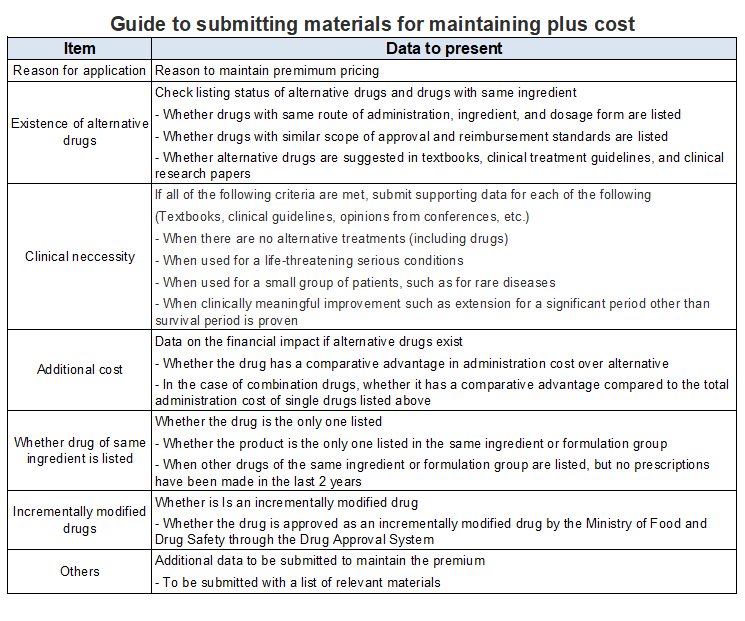 For drugs that were applied premiums over 3 years but less than 5 years, the authorities decided to maintain the premium if the drug satisfied at least one of the following criteria: ▲the non-existence of alternative drugs ▲clinical necessity ▲superiority in additional costs incurred ▲listing status of same ingredient drugs ▲IMD (Incrementally modified drug)