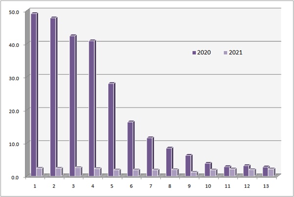 of suspected flu patients per 1,000 outpatient population during week1-13 in 2020·2021 (Unit: no.