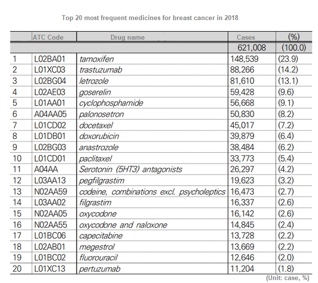 .The first to third anticancer drugs in the 1st group of frequent breast cancer were Goserelin, Tamoxifen, and Doxorubicn, which were the same from 2016 to 2018