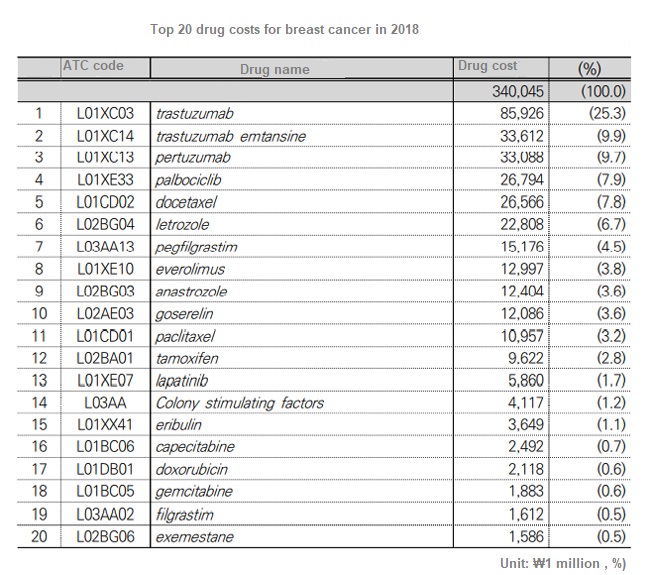 .In terms of anticancer drug costs, gastric cancer in 2018 was ₩76.4 billion and breast cancer was ₩340 billion, up 11.5% and 30% respectively compared to 2017.
