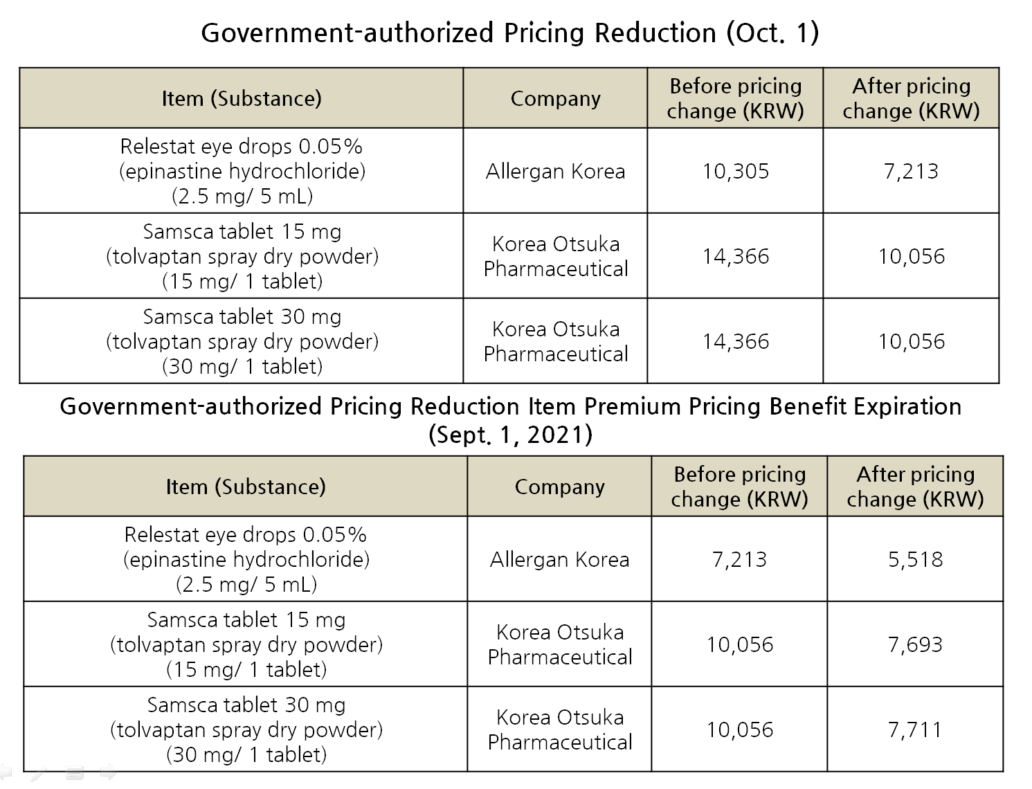 The pricings on Relestat eye drops 0.05% (epinastine hydrochloride) by Allergan Korea and Samsca tablet (tolvaptan spray dry powder) by Korea Otsuka Pharmaceutical would be lowered by 30 percent from next month as authorized by the government.