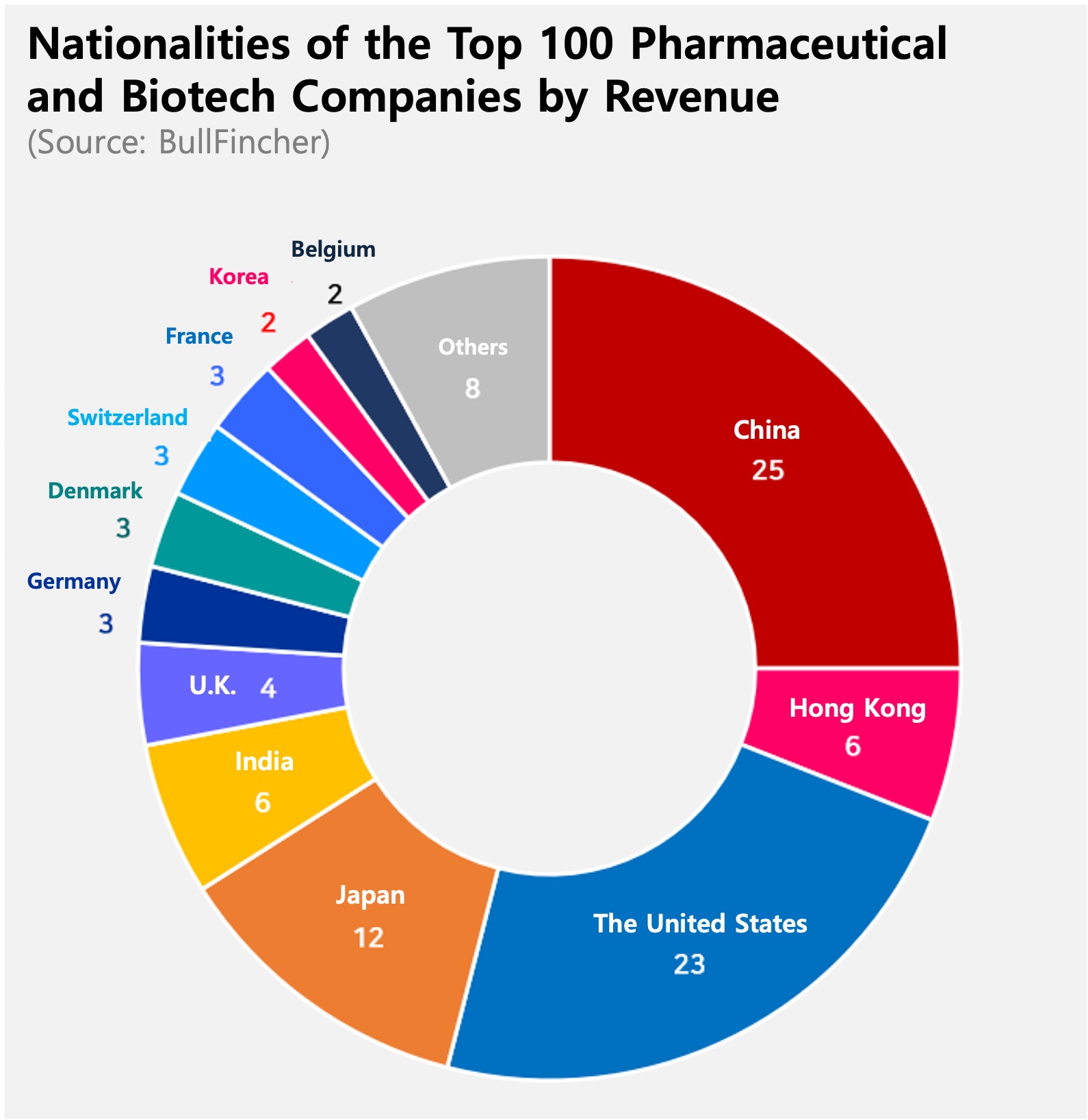 Among the top 100 pharmaceutical and biotech companies by revenue, Chinese and Hong Kong-based companies are the most numerous at 31.