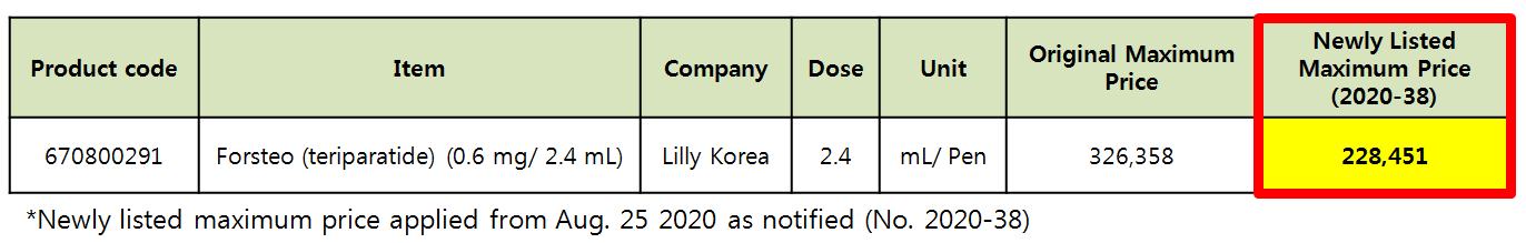 20, Ministry of Health and Welfare (MOHW) announced the pricing reduction on Forsteo would be authorized according to the original plan, as the Seoul Administrative Court has recently dismissed Lilly’s litigation.