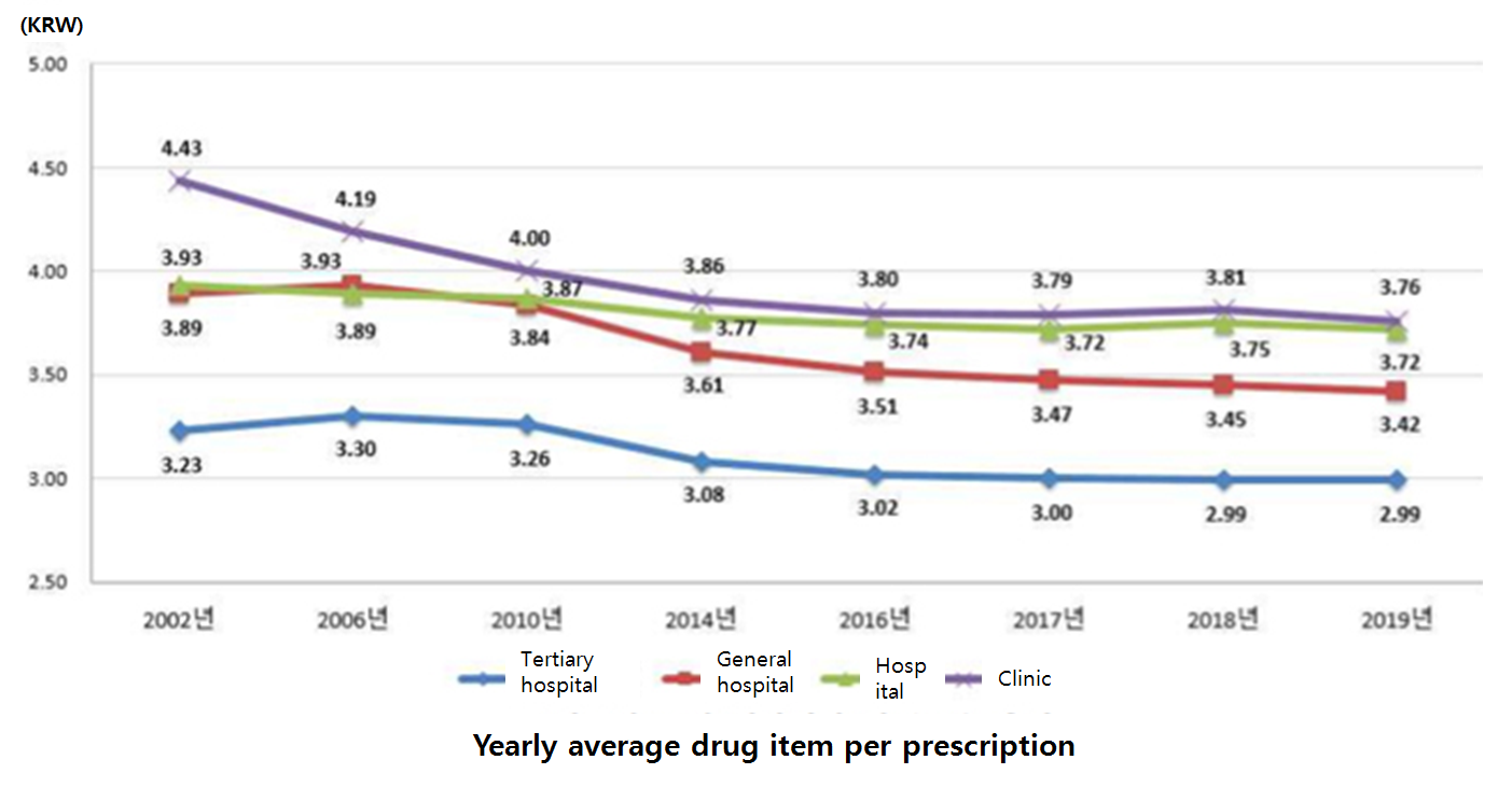 ◆Number of drug item per prescription: The number of drug item per prescription was tallied at 3.76 items, 3.72 items, 3.42 items, and 2.99 items in clinic, hospital, general hospital and tertiary hospital, respectively, with an average of 3.67 items.