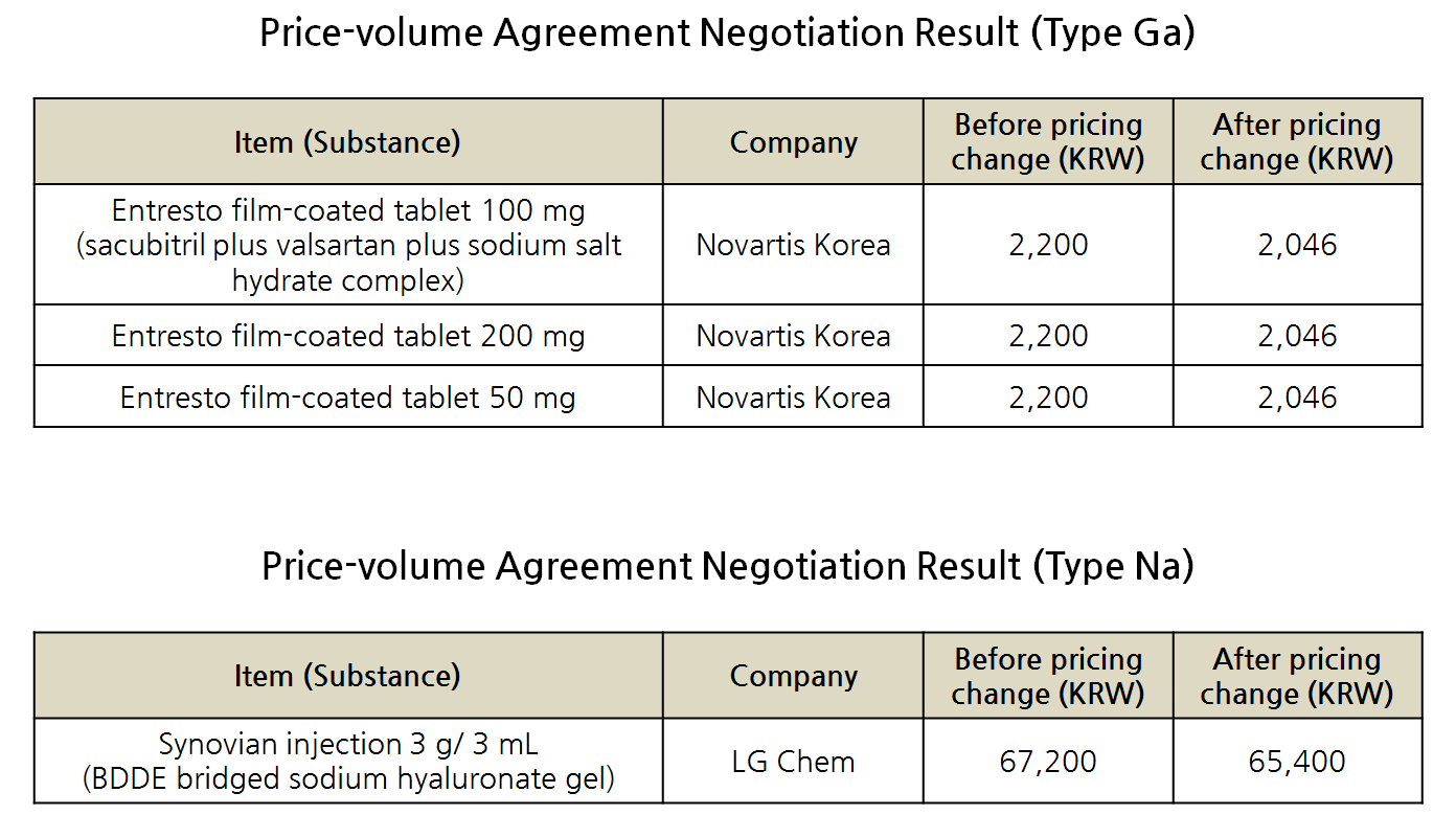 The prices of Novartis Korea’s Entresto film-coated tablet (sacubitril plus valsartan plus sodium salt hydrate complex) and LG Chem’s Synovian injection (BDDE bridged sodium hyaluronate gel) have been negotiated to be lowered by 7 percent and 2.7 percent, respectively, due to their increased use.