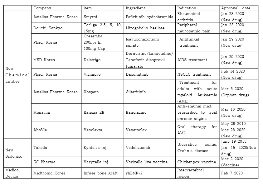 The MFDS (Minister Eui-kyung Lee) made the announcement on the 23rd, when it released a list of new medical products that were first approved in Korea, such as new drugs and newly developed medical devices, in the first quarter of 2020.