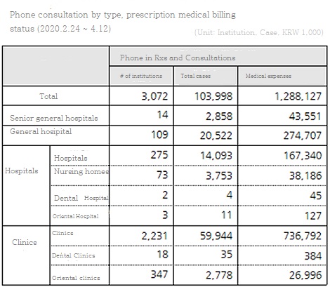 Subsequently, 109 general hospitals claimed 2,522 phone in consultations and prescriptions for reimbursed cost of ₩274,707,000.