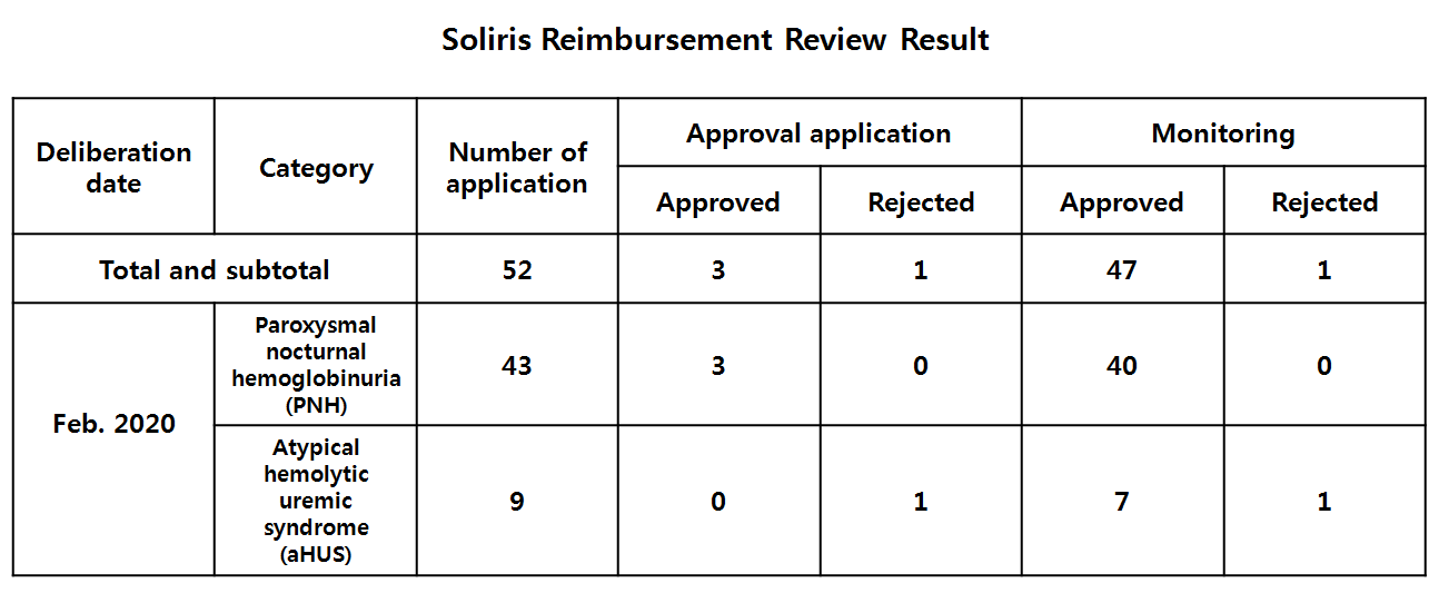 31, Health Insurance Review and Assessment Service (HIRA, President Kim Seung-taek) posted the results of pre-administration approval on four listed items—Spinraza, Soliris, ventricular assist device (VAD) and hematopoietic stem cell transplantation (HSCT)—Treatment Review and Assessment Committee deliberated in February.