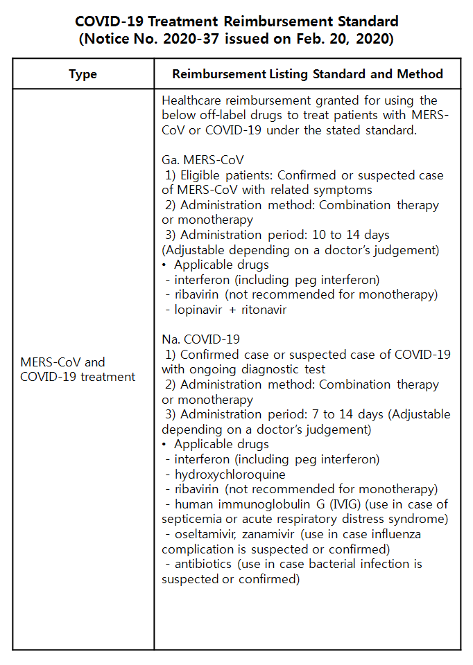 Nevertheless for the COVID-19 treatments, HIRA reported to the Ministry of Health and Welfare (MOHW) the reimbursement standard set based on the recommendation made by Korean healthcare experts on Feb.