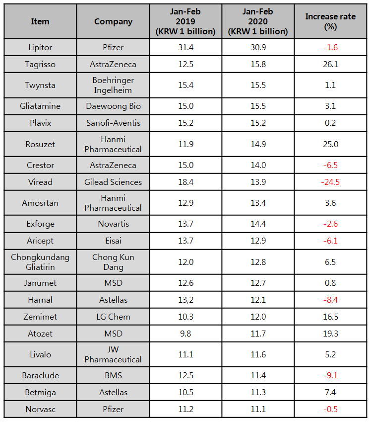 17, Pfizer’s dyslipidemia treatment Lipitor has made 30.9 billion won in last January and February combined, topping the outpatient prescription volume rank.