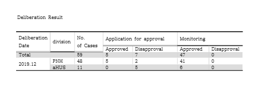 In the case of Soliris (Eculizumab), which had been subject to prior approval prior to Spinraza, there were prior applications of the total number of 59 cases (48 cases of Paroxysmal nocturnal hemochromatosis, PNH & 11 atypical hemolytic uremic syndrome, aHUS).