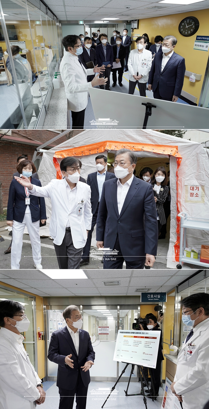 Moon made this report at the spot where he received on-site response system reports such as patient selection criteria, response measures, and operation procedures for screening clinics from the Director of National Medical Center Ki-hyun Chung and the Director of operation support team, Yeon-jae Kim.