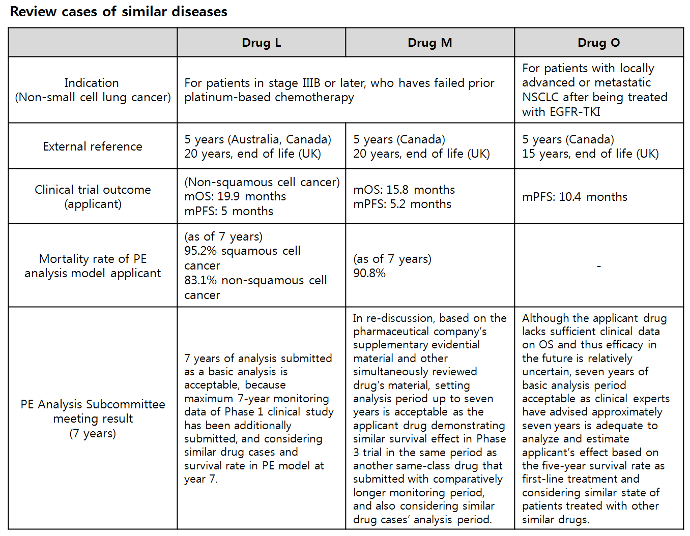 The research team studied deliberation cases of similar diseases and contemplated on patient age (cohort joining age), expected life expectancy of general population group, patient’s survival rate, analysis period of similar drugs, clinical trial outcome (median OS), monitoring period, clinical consulting, and uncertainty for calculating analysis period.