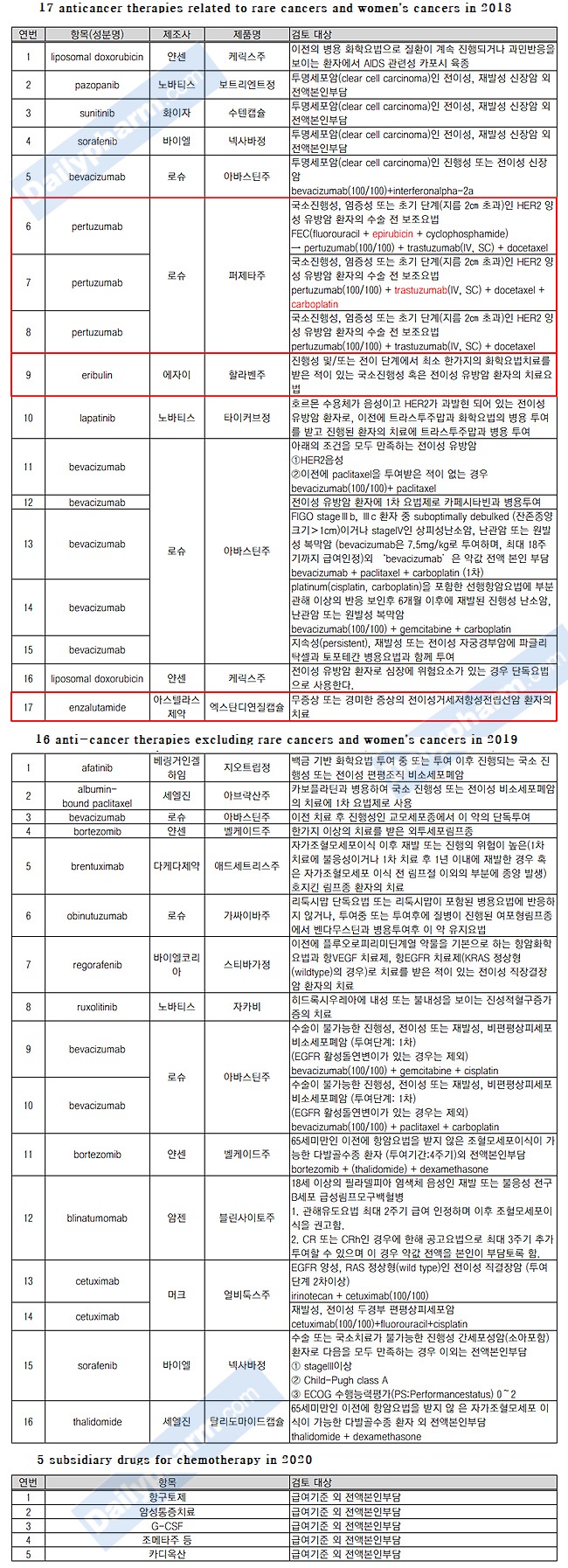 In order to strengthen health insurance coverage, six types of anti-cancer drugs, which had no reimbursement standard or remained as 'baseline non reimbursement' at 100% of the copayment rate, were selected as a screening benefit.
