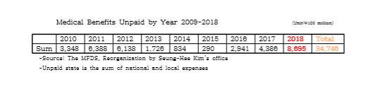 According to the MFDS, Ministry of Health and Welfare Committee Seung-Hee Kim's report presented at the National Audit, the unpaid medical benefit in 2018 was ₩869.5 billion, the highest ever.