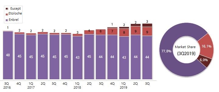 While Celltrion's 'Remsima' has achieved its performance, Samsung Bioepis' Remaroche, SB4, and LG Chem's ‘Eucept' have a weak presence.