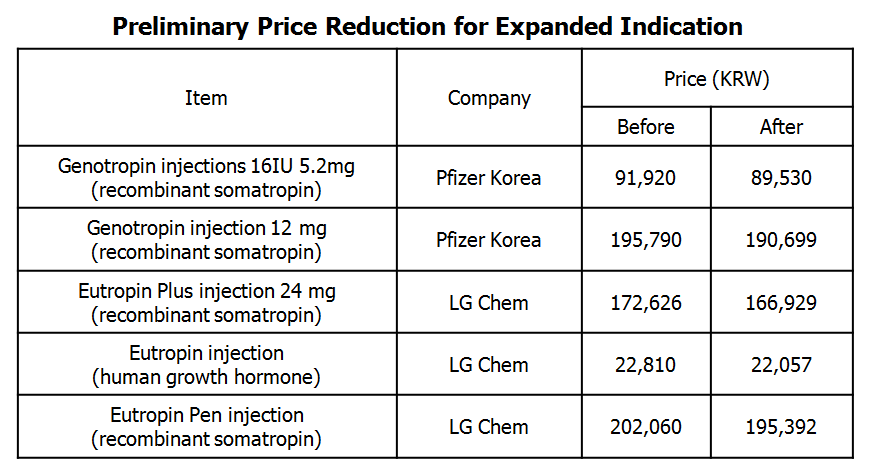 Five items, including Pfizer’s Genotropin injections (16IU and 12 mg), LG Chem’s Eutropin Plus injection (24 mg), Eutropin injection and Eutropin Pen, are subject for preliminary drug price reduction with expanded indication.