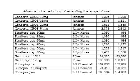 Concerta 18mg Tab will be lowered from ₩1,226 to ₩1,208, and Concerta 36mg Tab will be lowered from ₩1,849 to ₩1,821.