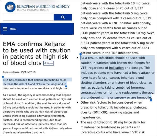 15, EMA posted an official statement about Xeljanz on its website In last July, the U.S.
