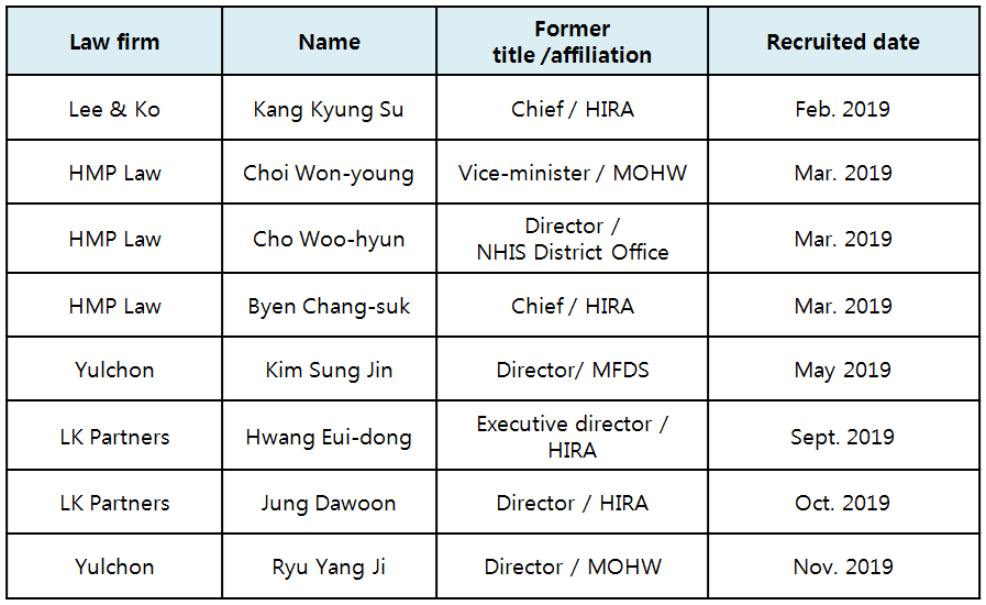 Just in this year alone, eight former government officials have been scouted by law firms, including former chief at HIRA Kang Kyung-soo; former vice-minister of Health and Welfare Choi Won-young; former Regional Office Director at National Health Insurance Service Cho Yoo-hyun; former executive director at HIRA Hwang Eui-dong; former director at HIRA Jung Dawoon; and former director at Ministry of Health and Welfare Ryu Yang-Ji.