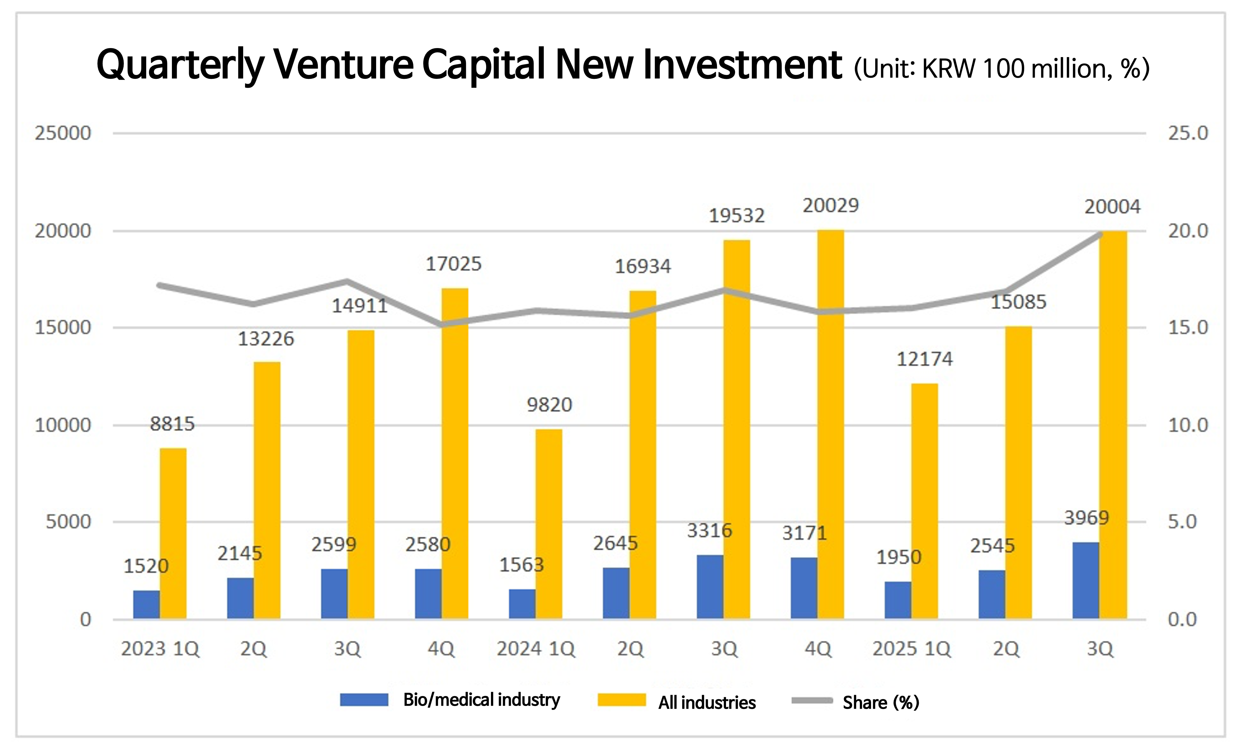 Quarterly investment volume increased by 56% compared to the previous quarter, and the bio/medical VC investment share within the industry rose to 20%.