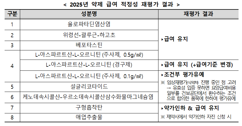 2025 Reevaluation Results for Pharmaceutical Reimbursement Appropriateness: Reimbursement maintained for 1. olopatadine hydrochloride 2. Clematidis Radix-Trichosanthes Root-Prunella Spike 3. Bepotastine…Drug price reduced and reimbursement maintained for 7. spherical adsorptive carbon and artemisia herb extract (upon voluntary requests for drug price reduction by pharmaceutical companies).