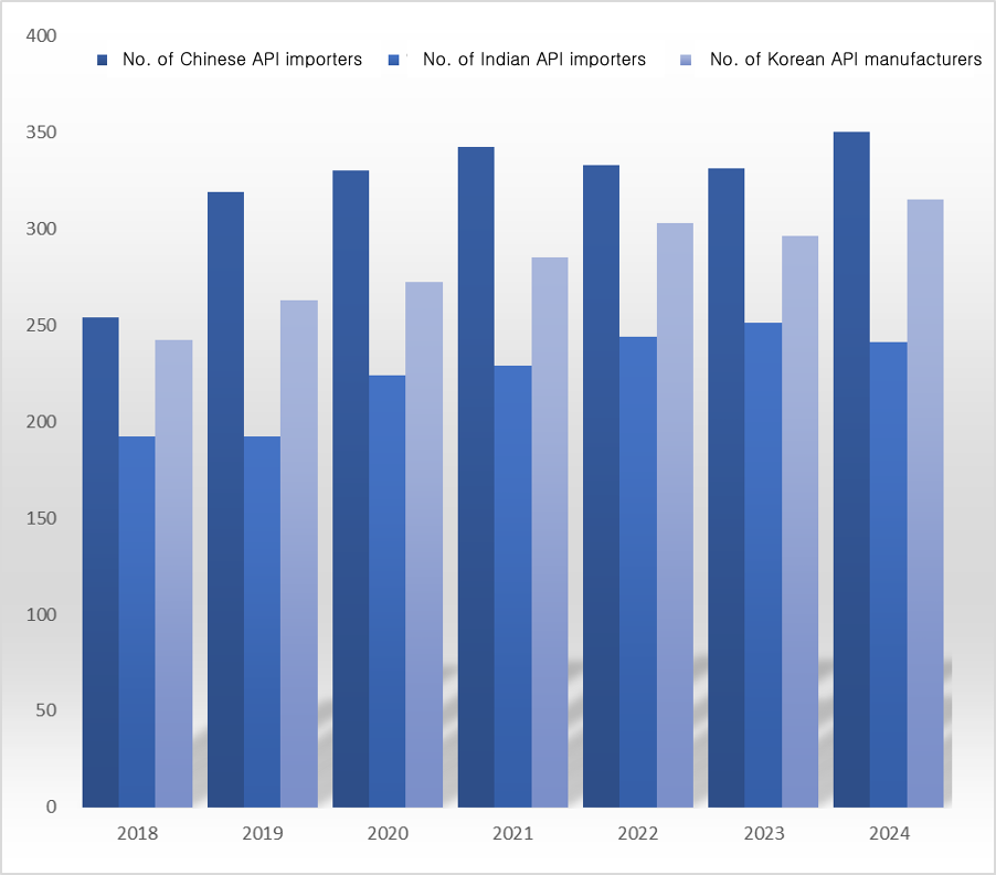 The number of Chinese active pharmaceutical ingredient (API) suppliers importing APIs into Korea continues to rise. Compared to six years ago, nearly 100 more Chinese companies are now supplying APIs to the Korean market, significantly outnumbering domestic producers. The scale of Chinese API imports has also steadily grown, indicating an expanding influence of Chinese products in the domestic market. In addition, as pharmaceutical companies face price pressure and seek lower-cost APIs, the number of Indian suppliers has also grown substantially.