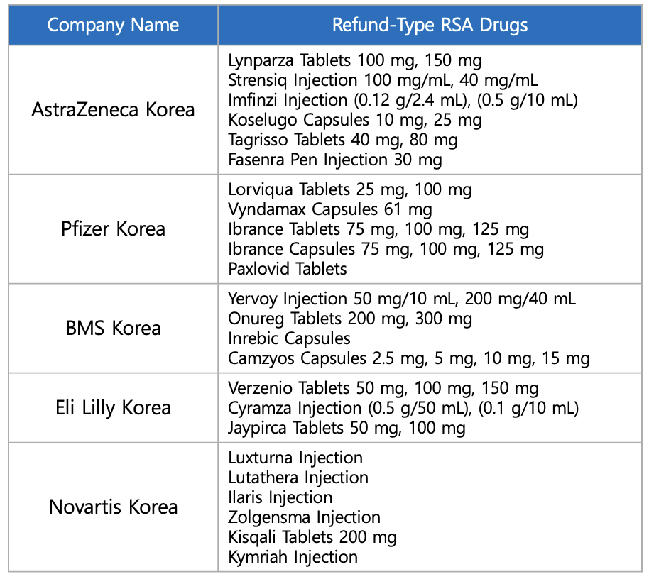 Domestic companies with refund-type RSA drugs include Yuhan’s Leclaza (lazertinib), JW Pharmaceutical’s Hemlibra (emicizumab), Handok’s Defitelio Inj (defibrotide), Vyxeos Liposomal Inj, and Pemazyre Tab (pemigatinib).