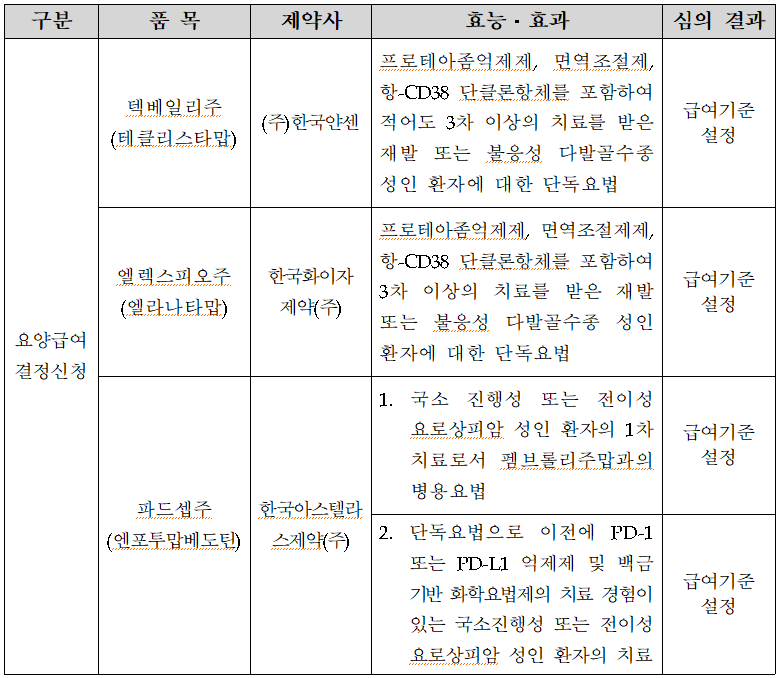 This time, Vyloy’s reimbursement criteria were established for ‘First-line treatment for patients with unresectable locally advanced or metastatic gastric or gastroesophageal junction adenocarcinoma who are CLDN18.2-positive and HER2-negative’ For Padcev, reimbursement criteria were set for both combination therapy and monotherapy, as ‘combination therapy with pembrolizumab as first-line treatment for adult patients with locally advanced or metastatic urothelial carcinoma’ and ‘monotherapy for adult patients with locally advanced or metastatic urothelial carcinoma who have previously received treatment with a PD-1 or PD-L1 inhibitor and platinum-based chemotherapy.’ In addition, Pfizer Korea’s Elrexfio (elranatamab) and Janssen Korea’s Tecvayli (teclistamab) also had their reimbursement criteria established, clearing their first hurdle for listing.