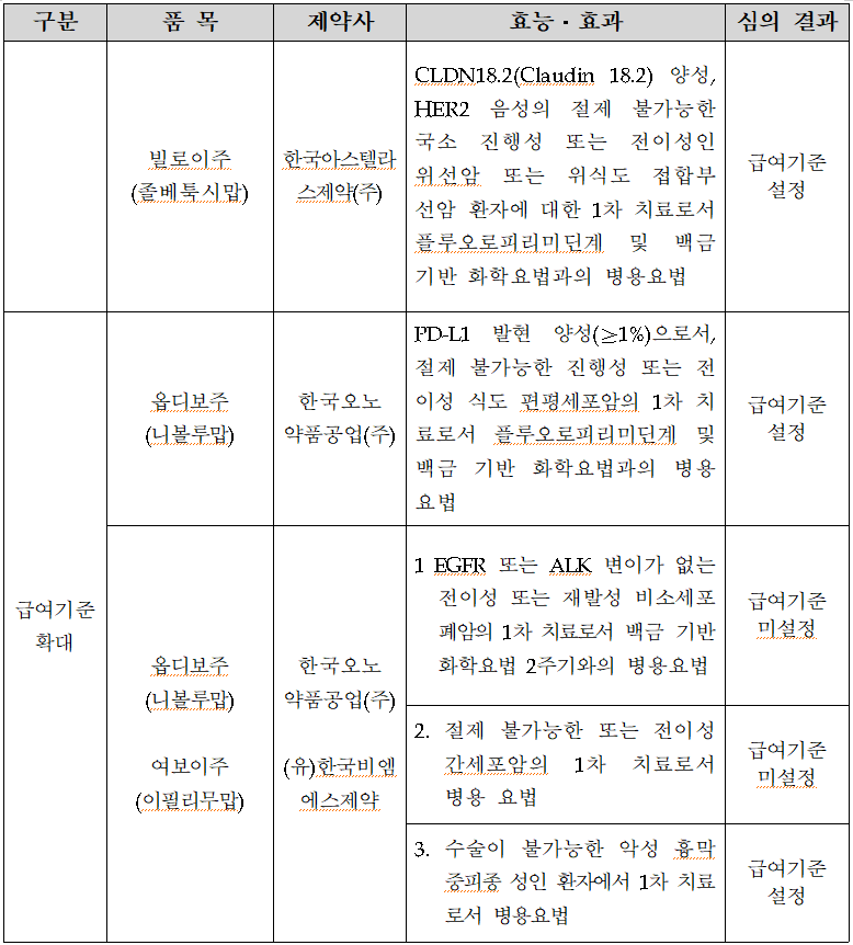 For Opdivo, which sought to expand the scope of reimbursement, criteria were set for its use in combination therapy as first-line treatment for metastatic esophageal squamous cell carcinoma.