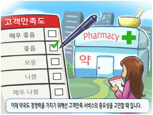 이제 약국도 타 업종과 마찬가지로 경쟁력을 가지기 위한 요소로 고객서비스를 빼놓고는 말할 수 없을 정도로 고객만족도의 중요성은 점점 커지고 있습니다.
