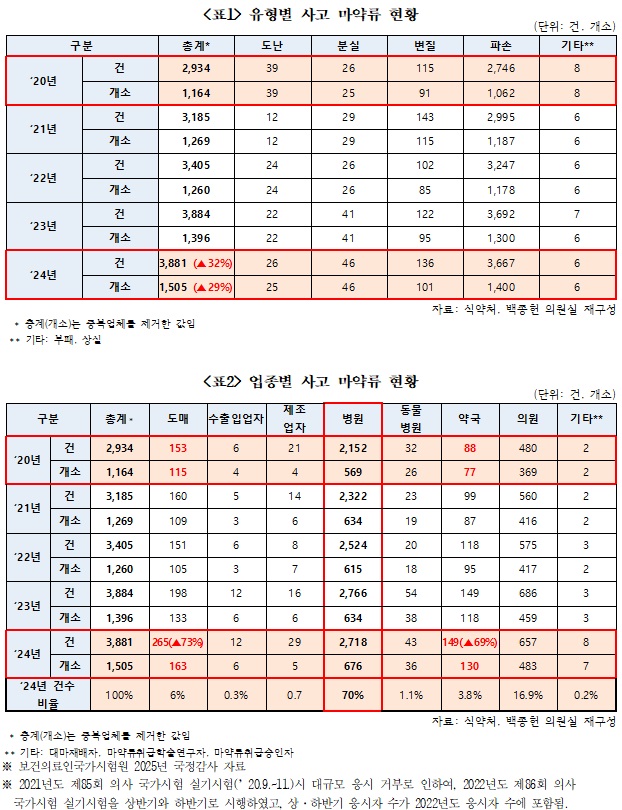 Áö³ÇØ(2024³â) ±âÁØ ¸¶¾à·ù »ç°í °Ç¼ö´Â 3881°Ç, »ç°í ¹ß»ý Àå¼Ò´Â 1505°³¼Ò·Î 2020³â ´ëºñ °¢°¢ 32%, 29% Áõ°¡Çß´Ù. ÆÄ¼Õ»ç°í°¡ ¸Å³â ´ëºÎºÐÀ» Â÷ÁöÇßÀ¸¸ç, º¯Áú¡¤ºÐ½Ç »ç°íµµ Áõ°¡¼¼¿´´Ù.