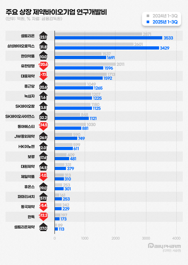 [µ¥Àϸ®ÆÊ=õ½ÂÇö ±âÀÚ] Á¦¾à»çµéÀÌ Â÷¼¼´ë ¸Ô°Å¸® ¹ß±¼À» À§ÇÑ ¿¬±¸°³¹ß(R&D) ÅõÀÚ ºñ¿ëÀ» Å©°Ô È®´ëÇß´Ù. ÁÖ¿ä Á¦¾à¹ÙÀÌ¿À±â¾÷ 10°÷ Áß 7°÷ÀÌ ¿ÃÇØ R&D ÅõÀÚ ºñ¿ëÀ» À۳⺸´Ù È®´ëÇß´Ù. ¼¿Æ®¸®¿Â°ú »ï¼º¹ÙÀÌ¿À·ÎÁ÷½ºÀÇ ÅõÀÚ ±Ô¸ð°¡ °¡Àå Äǰí Çѹ̾àǰ, Á¾±Ù´ç, SK¹ÙÀÌ¿À»çÀ̾ð½º, JWÁß¿ÜÁ¦¾à µîÀÌ R&D ÅõÀÚ¾×ÀÌ Å©°Ô Áõ°¡Çß´Ù.