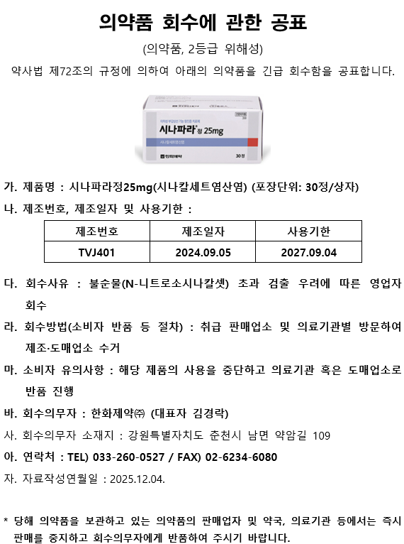 한화제약 시나파라정 회수 공표