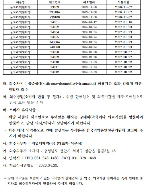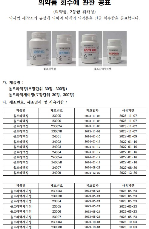 맥널티제약 울트라맥정/울트라맥세미정 회수