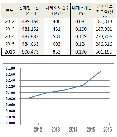 장려금 지급액도 건수에 비례해 늘었다. 2012년 1억8181만원이었던 지급액은 이듬해 1억8790만원, 2014년 2억2370만원으로 늘었고 2015년 2억4661만원, 지난해 들어 3억원대를 넘어서면서 3억115만원을 기록했다.