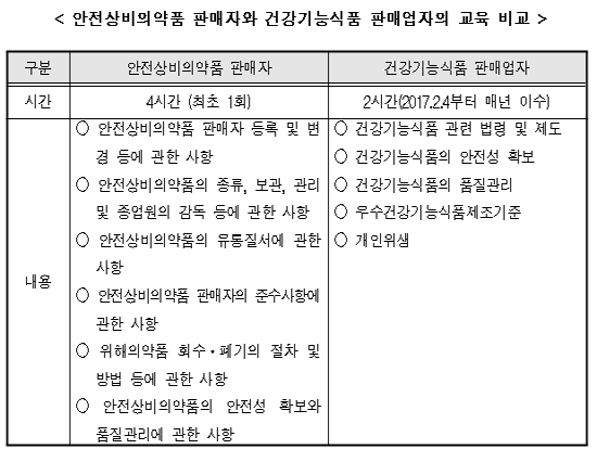 대한한의사협회도 "건강기능식품과 안전상비의약품은 각각 건강기능식품에 관한 법률과 약사법에 의해 관리되고 있으며, 판매자에 대해 실시하는 교육도 시간·내용 등에 차이가 있으므로 건강기능식품과 관련해 교육을 이수한 자만이 건강기능식품판매업을 할 수 있도록 한 현행 규정을 유지하는 게 타당하다"고 했다.