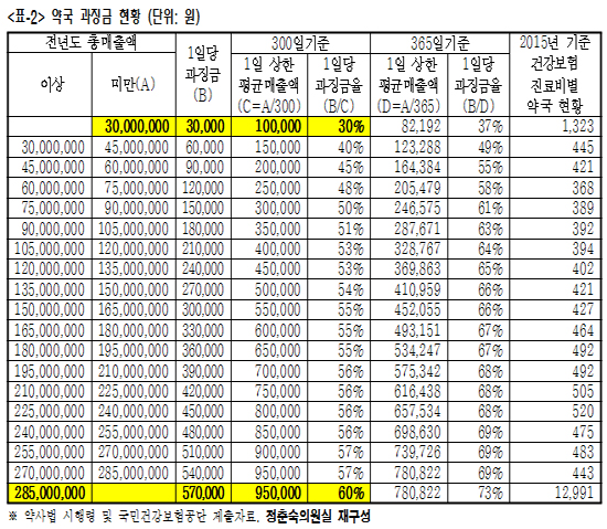종합하면 약국은 매출액이 많은 기관에게 더 과중한 누진적인 과징금제도가 운영되고 있는 반면, 의료기관은 수입액이 높은 돈을 잘버는 의료기관에게 더 유리한 역진적인 방식으로 운영되고 있다고 정 의원은 지적했다.
