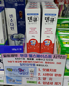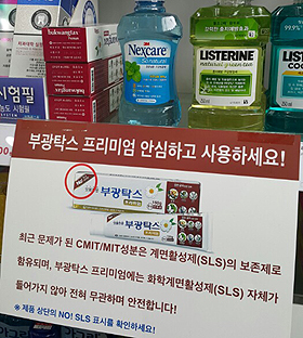 POP에는 '덴큐 헬스페이스트 치약은 가습기 살균제 성분(MIT/CMIT)이 함유되지 않은 일반의약품 제품'이라고 홍보했다.