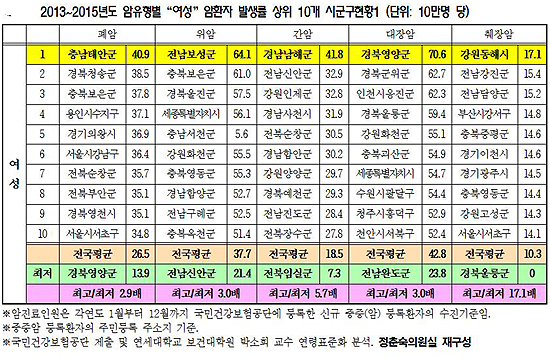 또한 여성 피부암은 전남 담양군이 10만명당 26.3명(전국평균 12명), 갑상샘암은 전국 장흥군이 10만명당 164.8명(전국평균 110.6명)으로 가장 높았다. 유방암은 충남 계룡시가 10만명당 109.5명(전국평균 82.4명), 자궁경부암은 충북 증평군이 10만명당 33.5명(전국평균 16.6명)으로 전국 암 발생률 최고를 기록했다.