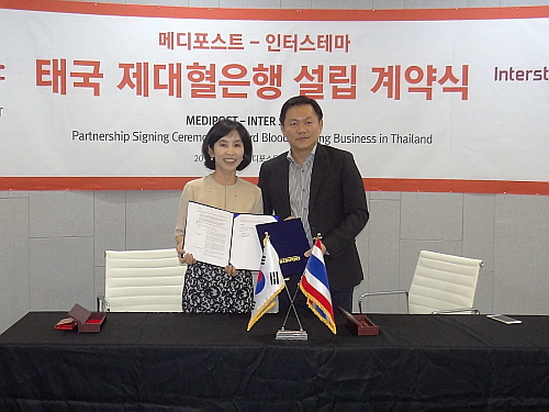 4일 계약식은 양윤선 메디포스트 대표와 사칼라톤(S. Sakchalathorn) 인터스테마 대표 등이 참석한 가운데 메디포스트 판교 본사에서 개최됐다. 내년 초까지 인터스테마 제대혈은행 설립을 완료한 뒤 곧바로 제대혈 보관사업을 개시한다는 계획.